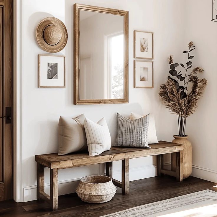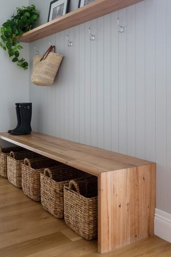 Un banc d’entrée est un ajout pratique, parfait pour enfiler vos chaussures. Ajoutez des casiers ou des paniers en dessous pour ranger les chaussures de manière discrète.